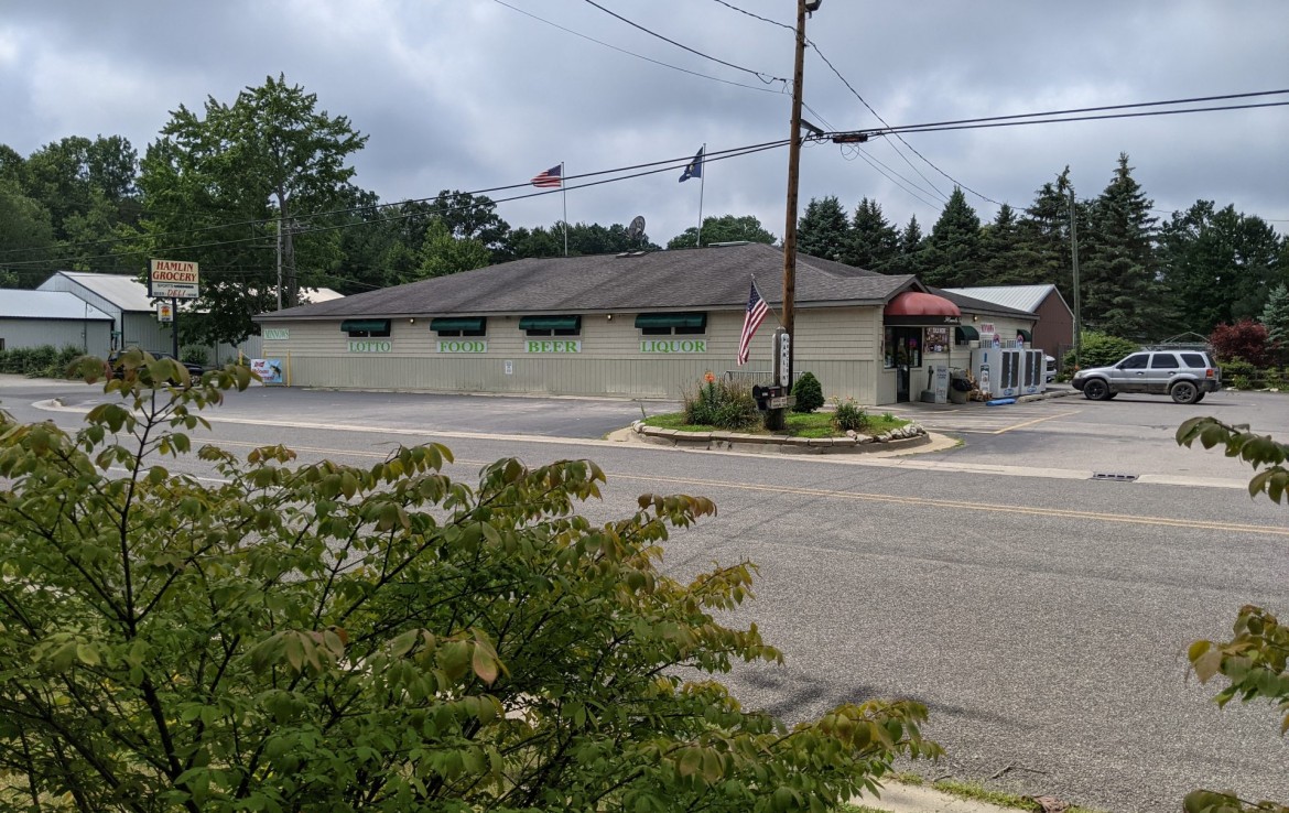 Ranch Home, Garage, Barn on 2.77 acre lot zoned commercially right across from the popular Hamlin Grocery servicing Hamlin Lake tourism and full time residents is now for sale. Excellent high traffic corner with two way stop and 3 entries from the roadways. It is the opportunity you have been waiting for to realize the American dream of being a small business owner in one of the most sought-after townships and vacation areas in Michigan.  First, you will have to decide if you would like to improve the house a bit and live in it or turn that into solid rental income. The potential to make money is around every corner here.