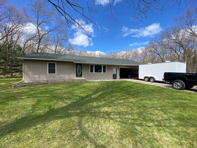 Rare Offering! Fantastic 5.5 Acres with 3 bedroom, 1 Bath home, 2 Car attached garage, partially finished basement, wooded and updates done and to be completed. Roof, siding and windows were updated in 2015. Hotwater heater replaced in 2017. Boiler replaced in 2015. Seller is installing vinyl plank flooring throughout majority of house (completion soon). From this location you are only 1 mile from beautiful Wolfe Lake. If you want a nice ranch home on a private setting yet near all the amenities needed to be comfortable this place is for you!